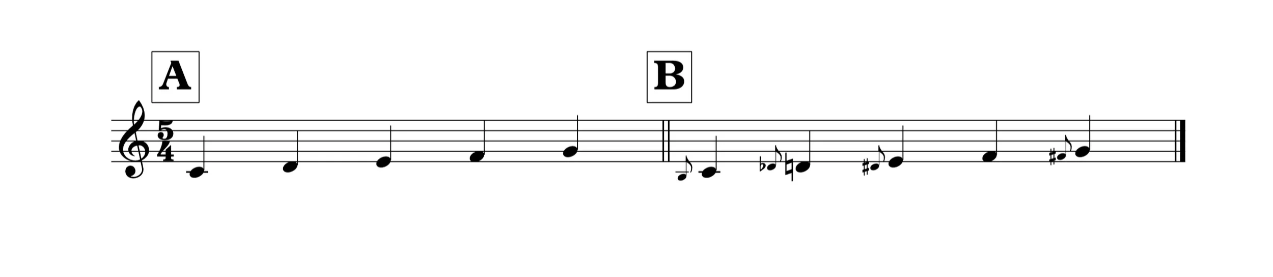 The notes in the ‘A’ measure represent pitches that students learn when building up understanding of scales. The notes in ‘B’ (inspired by Old Town Road) show how those notes are frequently skewed within pop/rock/blues/jazz contexts. Again with the reading analogy, it would be like teaching a first grader how to spell but then - just for fun - throwing in slang and alternate word appearances like ‘nite’ or ‘y’all’. You wouldn’t do it, would you?